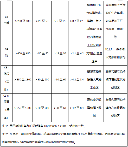 注:腐蚀性等级也可以通过下列环境因素的综合作用来估算:年潮湿时间,二氧化硫的年平均浓度和氯化物的年平均沉降量(GB/T 19292.1)